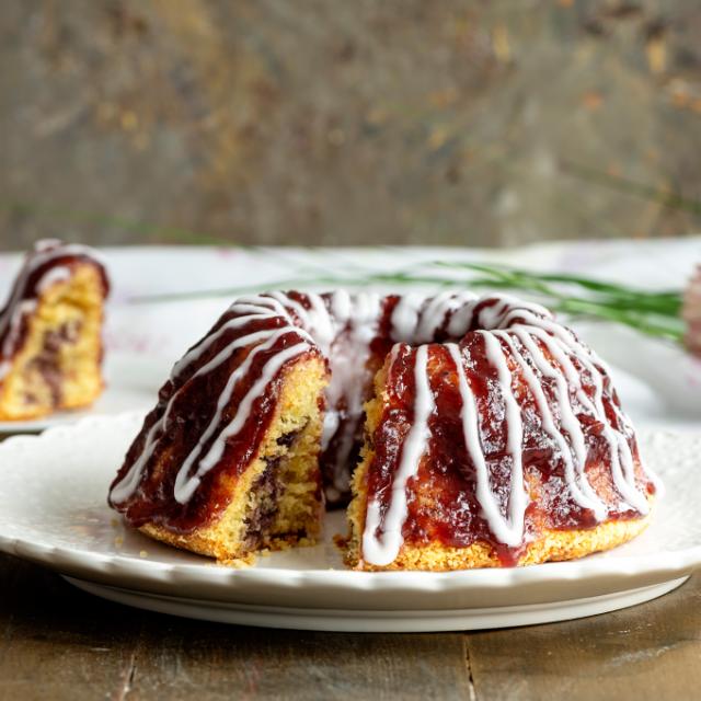 Laita puolet taikinasta vuokaan ja levitä päälle kerros vadelmamarmeladia. Levitä päälle loput taikinasta. Kypsennä kakkua uunin alaritilätasolla 175 asteessa noin 50 minuuttia. Kumoa kakku ja anna jäähtyä.